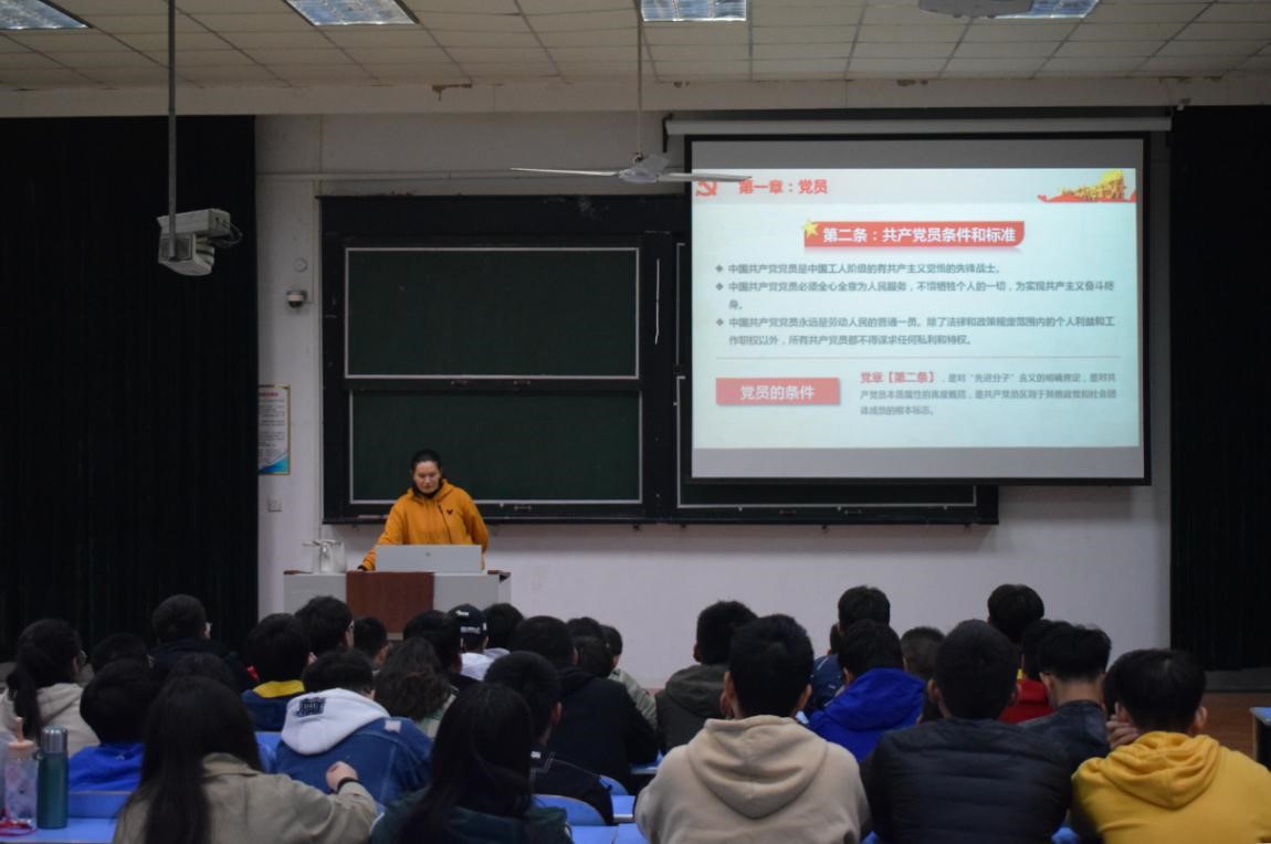 徐庆栖老师带领学员共同回顾党的十九次全国代表大会以来党章的发展历程,着重介绍了党章的发展历史、党章的总纲、党章的条文等,勉励大家学习和遵守党章并加深同学们对中国共产党的战斗堡垒作用和党员的先锋模范作用的认识,提高政治理论素养,鼓励同学们在学习、工作与生活中学以致用,争取早日入党。