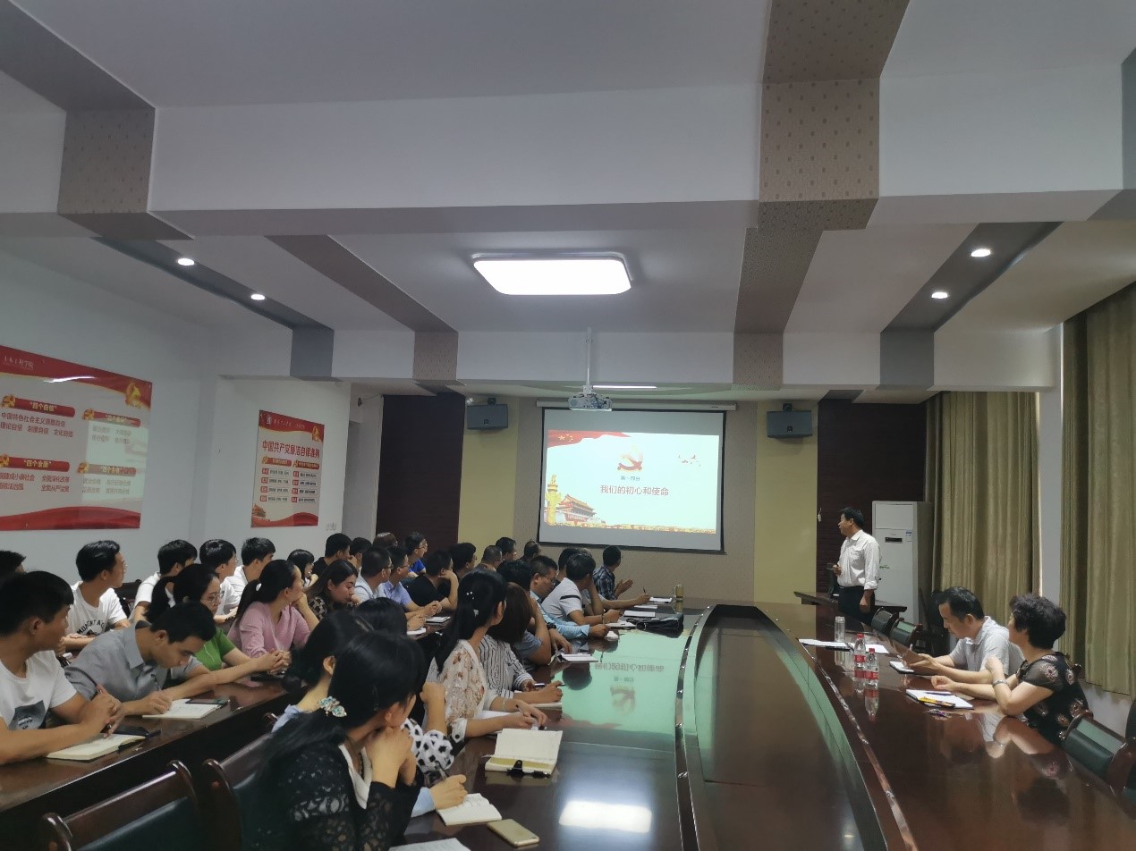 杨庆年书记从“我们的初心和使命”、“守初心、 担使命、找差距、抓落实”、“新时代,新要求”、“新时代下党员先进性、纯洁性”和“立足岗位出成绩”等 五个方面进行了讲述。杨书记强调,作为教师要为人师表、立德树人,作为员工要志存高远、脚踏实地,争做国家的骨干和栋梁。杨书记要求,作为党员要理论学习有收获、思想政治受洗礼、为民服务解难题、清正廉洁作表率,并通过不断加强自身思想道德建设、提高自身的理论文化素质、增强自身为群众服务的观念,保持新时代下党员的先进性、纯洁性。