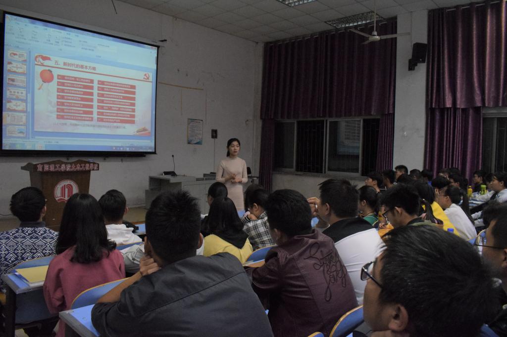 培训伊始,任老师与同学们交流了前两节的学习心得,并针对同学们存在的疑问进行了细致地解答。此次培训,任老师以“新时代,新征程,新目标”为主题,结合“党的十九大简介及重要意义”、“中国特色社会主义进入了新时代”、“新时代中国特色社会主义思想”、“新时代中国共产党的历史使命”等七个方面为同学们解读了党的十九大精神。在此次培训过程中,任老师与同学们亲切交流,为同学们耐心解答了问题。最后,任老师希望同学们坚持“不忘初心,砥砺前行”的十九大精神。