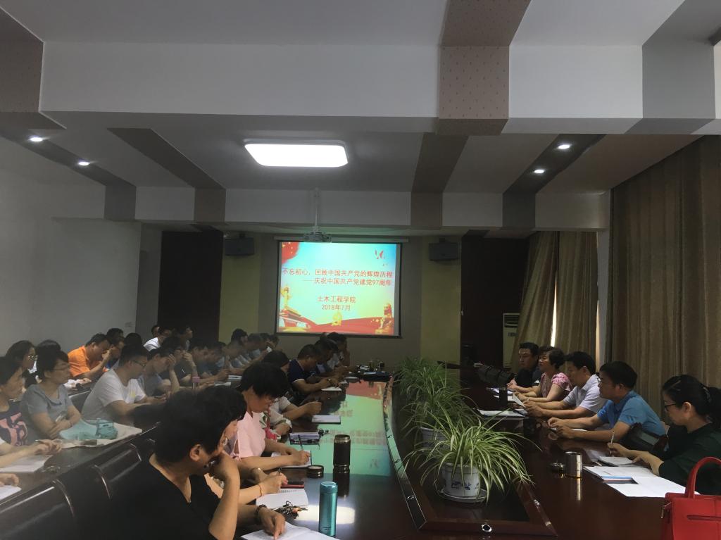 为庆祝建党97周年,7月3日下午,土木工程学院党委开展“不忘初心、牢记使命”主题党日活动,在学院会议室集中学习中国共产党的辉煌历程,由杨庆年书记主讲,全体教师党员参加。