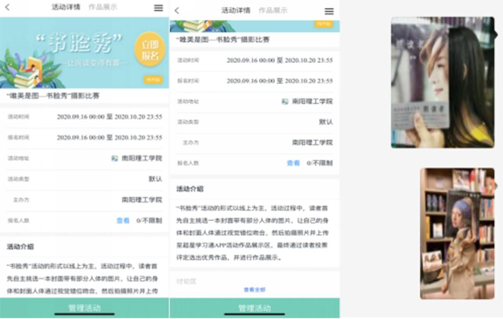 “书脸秀”活动的形式以线上为主,活动过程中,读者首先自主挑选一本封面带有部分人体的图片,让自己的身体和封面人体通过视觉错位吻合,然后拍摄照片并上传至超星学习通APP活动作品展示区,最终通过读者投票评定选出优秀作品,并进行作品展示。