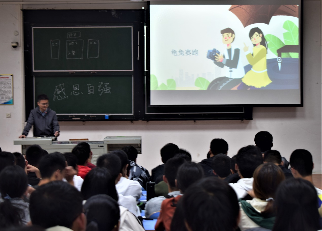 (宣传部 文/马圣亚 图/彭依婷)9月17日晚七时,公司于五阶二教室举办2019级新生“感恩自强”讲座, 2019级辅导员陈哲老师担任主讲人,2019级全体新生参加。
