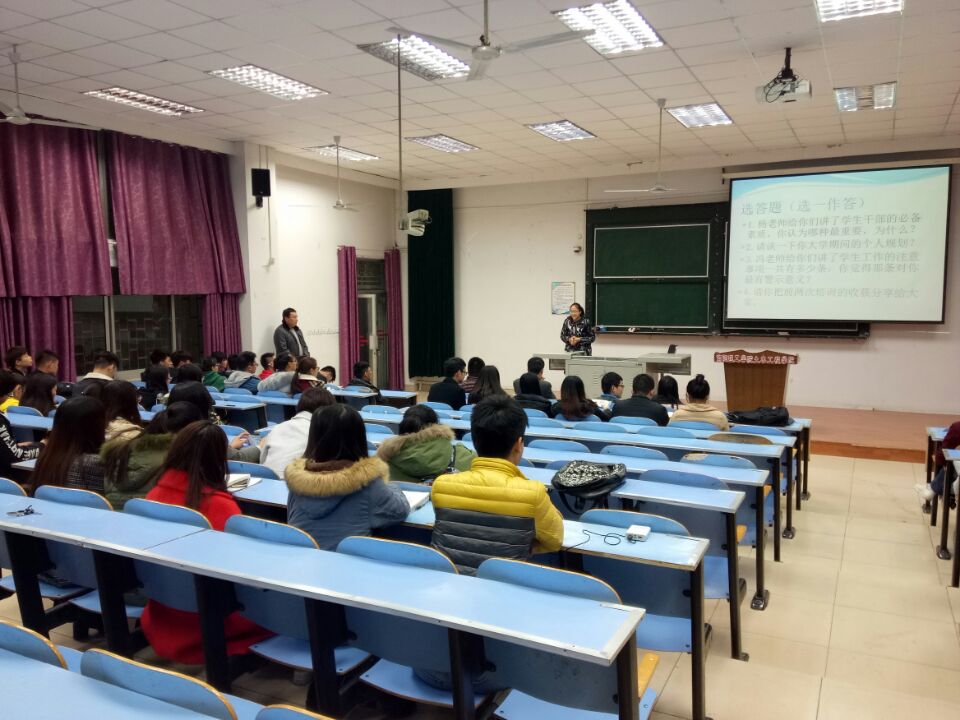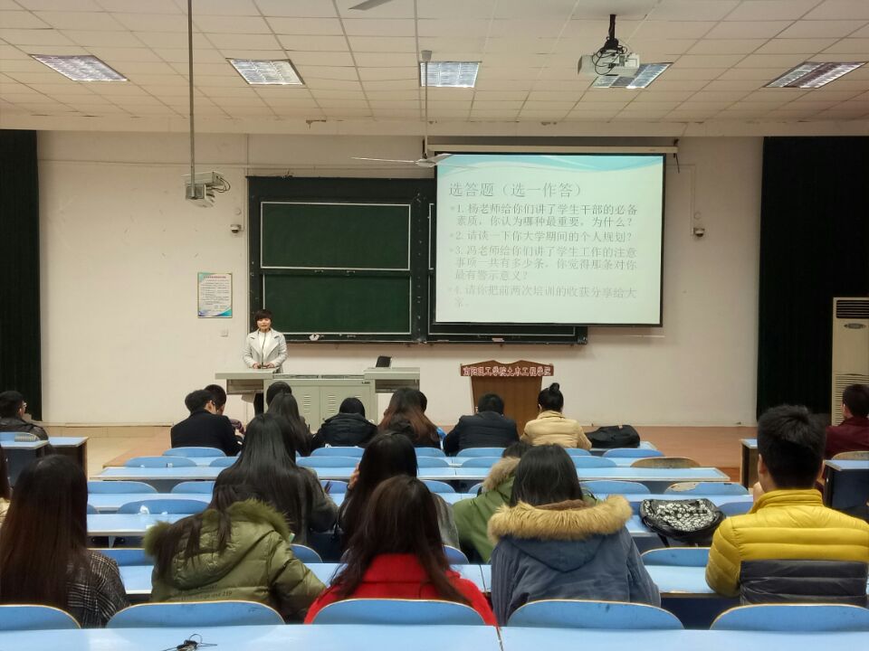 任老师将此次培训讲座转换为组内讨论形式,在座各级员工干部分为八组,围绕“当员工干部的动力”进行为期十分钟的主题讨论,组内依次推选同学上台作答,其中以第四组同学代表发言最为深入,他讲及自身干部工作经历,并用“岂能尽事如意,只求不愧我心”做出总结。最后,任老师为员工干部送出寄语——希望各位员工干部再接再厉,做好本职工作。