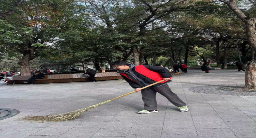在此次活动中,同学们手提着垃圾袋在路边捡拾垃圾,沿着公园的小路一直向前推进,对大量的落叶和垃圾进行了处理,工作结束后进行了合影留念。