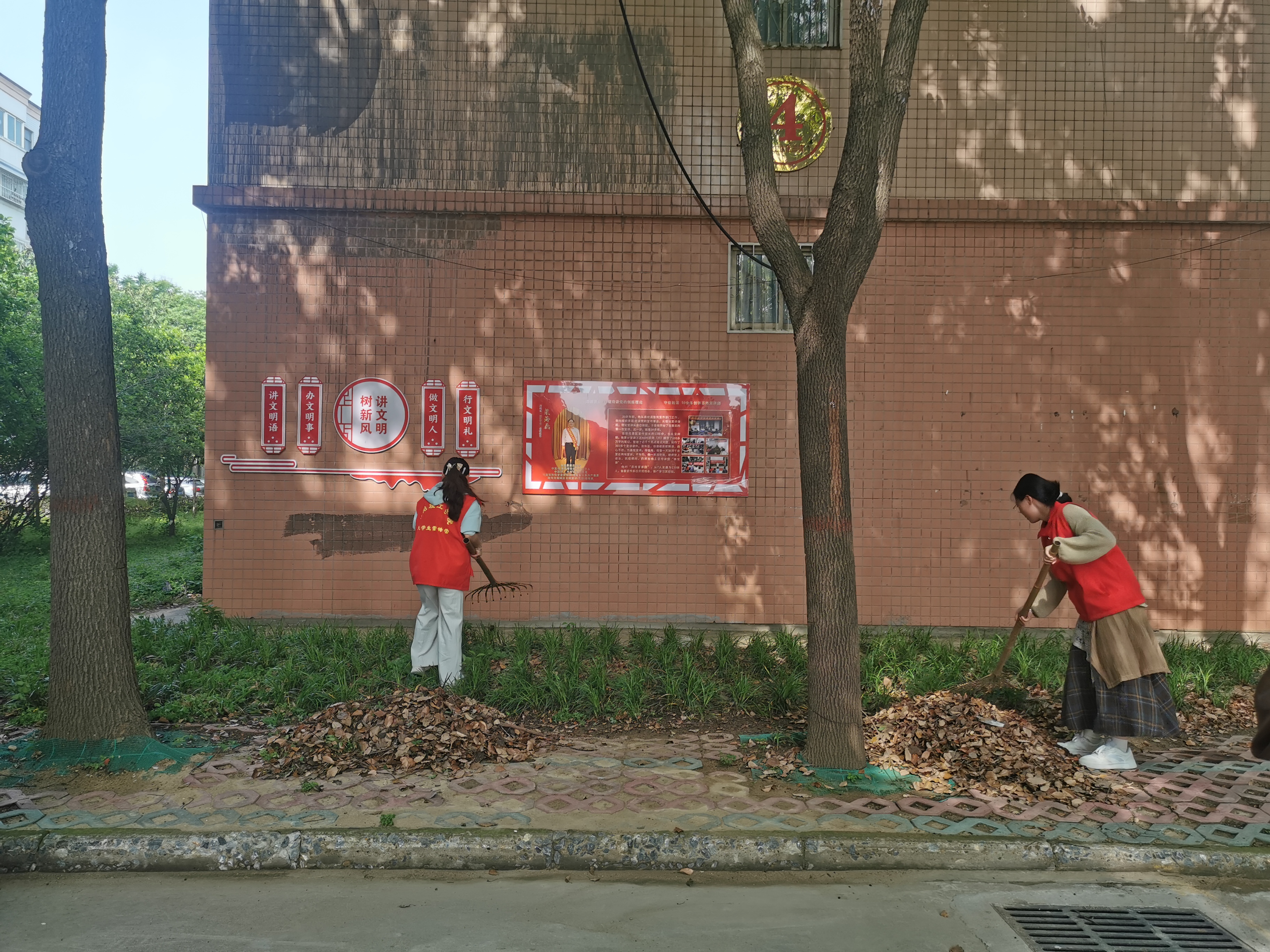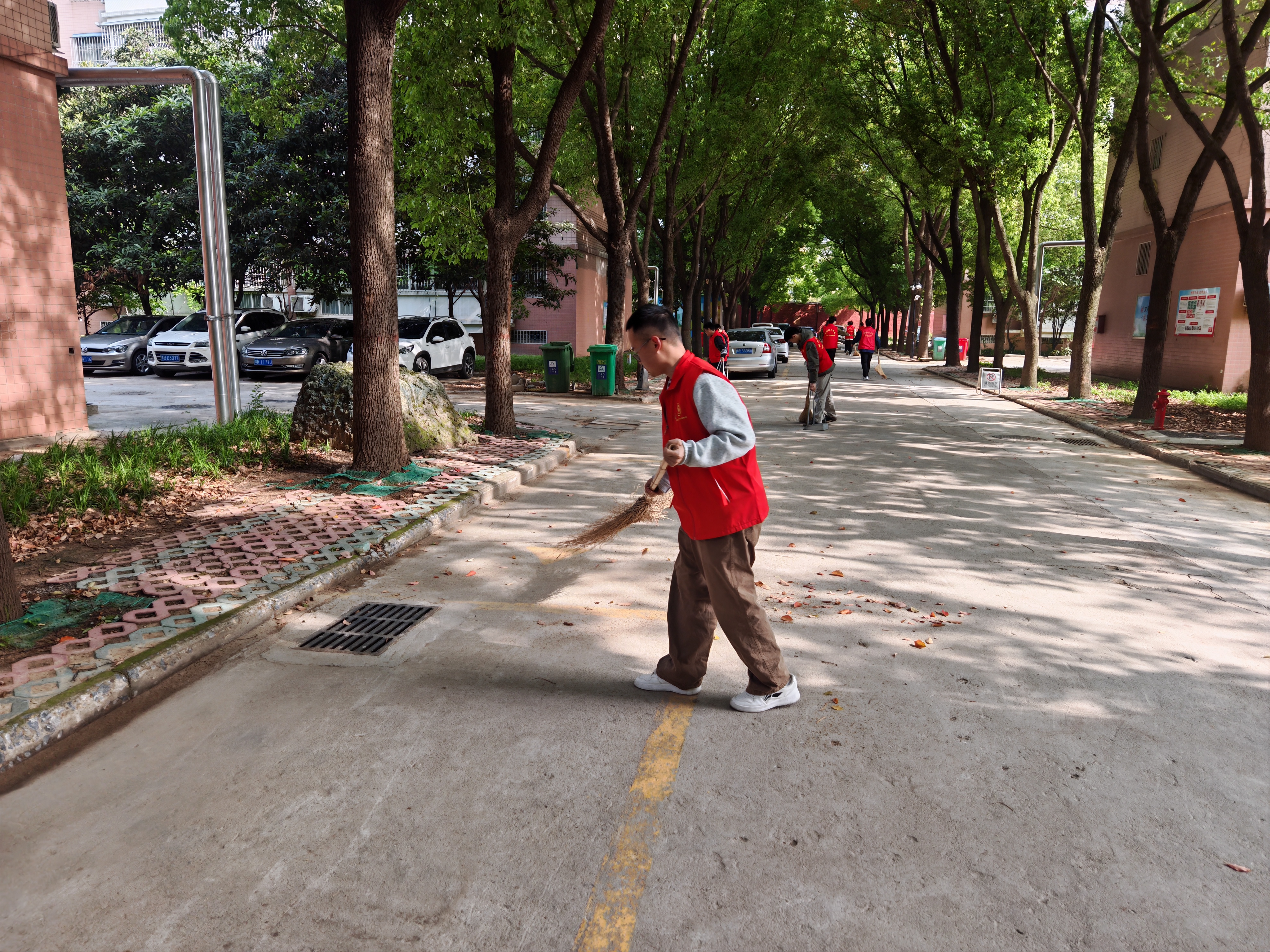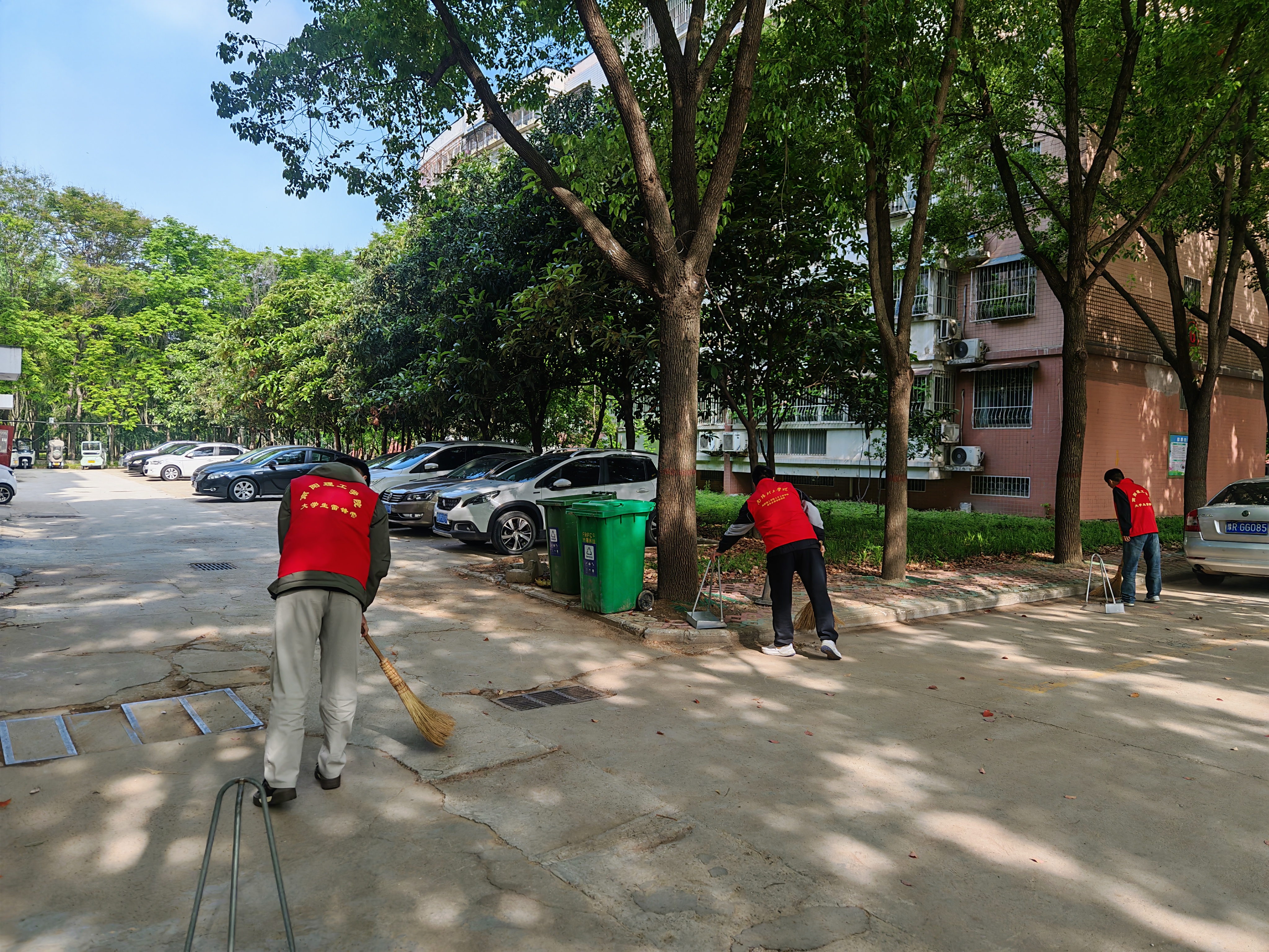 活动中,志愿者们耐心细致擦拭楼梯的扶手和栏杆,清扫台阶上的灰尘,对停车场、人行道、草丛等多处的落叶进行全面清理,不放过任何一个卫生死角,同时对乱停乱放的电动车、自行车进行规范整理,将车辆整齐摆放到指定区域,用实际行动为校园环境贡献力量。烈日下,志愿者们额头上布满汗珠,衣服被汗水浸湿,热情高涨、分工协作,展现出强大的凝聚力与战斗力。经过数小时的辛勤劳作,教师住宿社区的楼道、公共区域、绿化带等环境焕然一新,卫生被彻底清理干净,地面整洁,绿植生机勃勃,营造出了一个舒适、优美的校园环境。