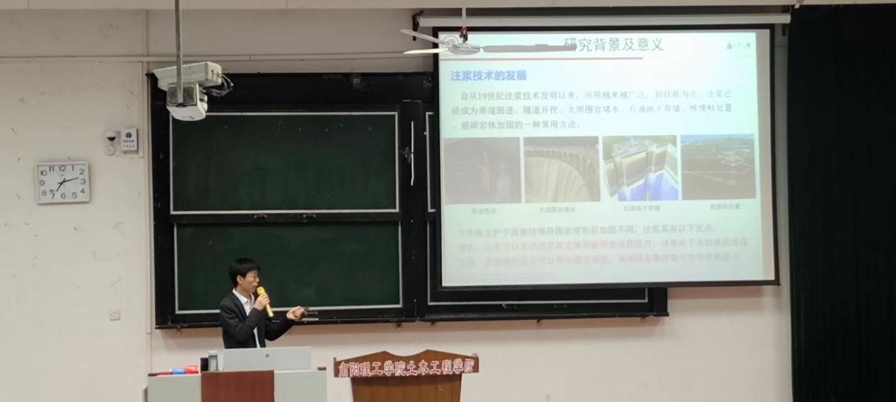 孙小康老师从研究纳米改性水泥基注浆的背景到国内外对其的研究现状进行了详细讲解,然后又结合三种浆流实验的研究让同学们对其有一定的认识,激发同学对注浆技术的兴趣。最后总结三种实验情况,分析了水灰比对水泥浆液流型的影响,研究了水灰比、水泥颗粒粒径、减水剂等因素对水泥浆液流变特性的影响。
