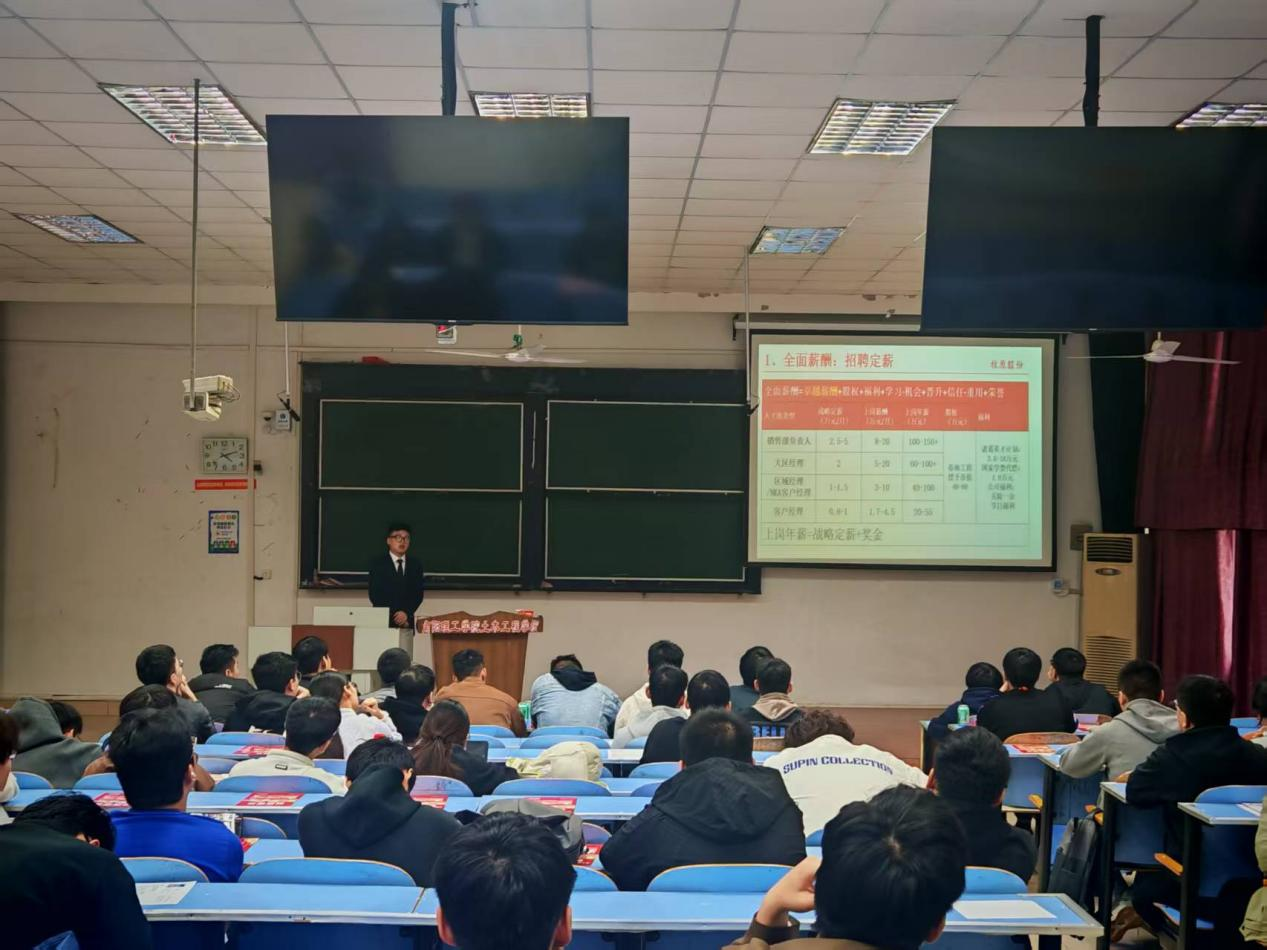 康硕详细介绍了企业的发展历程、核心业务及人才培养体系,重点解读了本次招聘的设备工程师、客户经理、供应链管培生、仓储管理等6个岗位的职责要求与晋升路径,并现场展示了企业员工的工作环境与福利待遇,使同学们对未来职场生活有了更直观的认知。