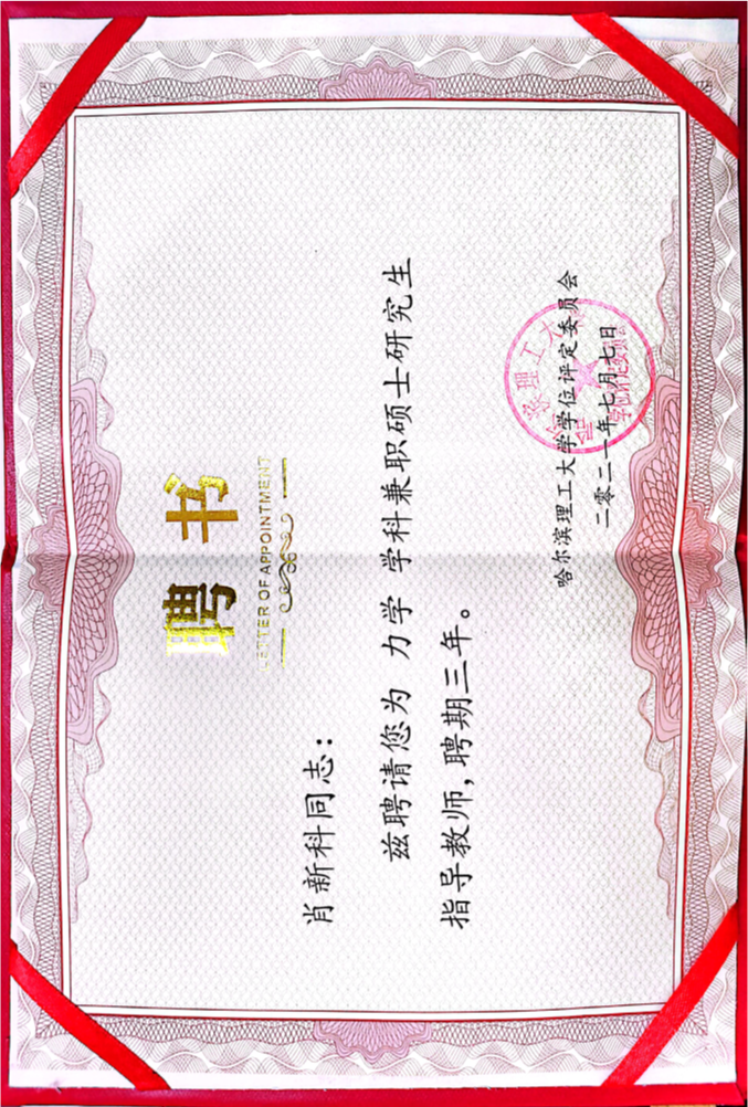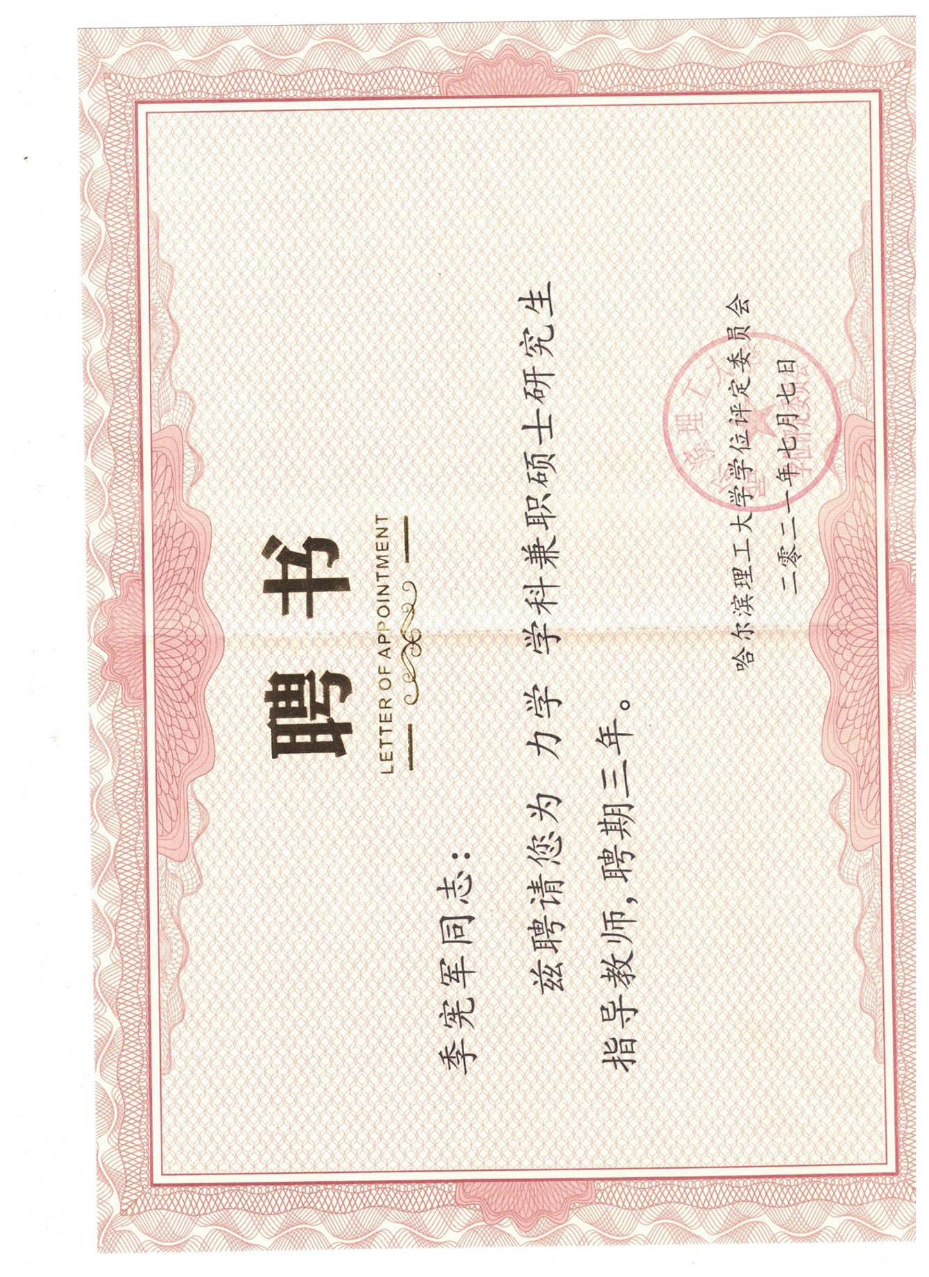 季宪军教授和肖新科副教授获聘为哈尔滨理工大学硕士研究生指导教师。